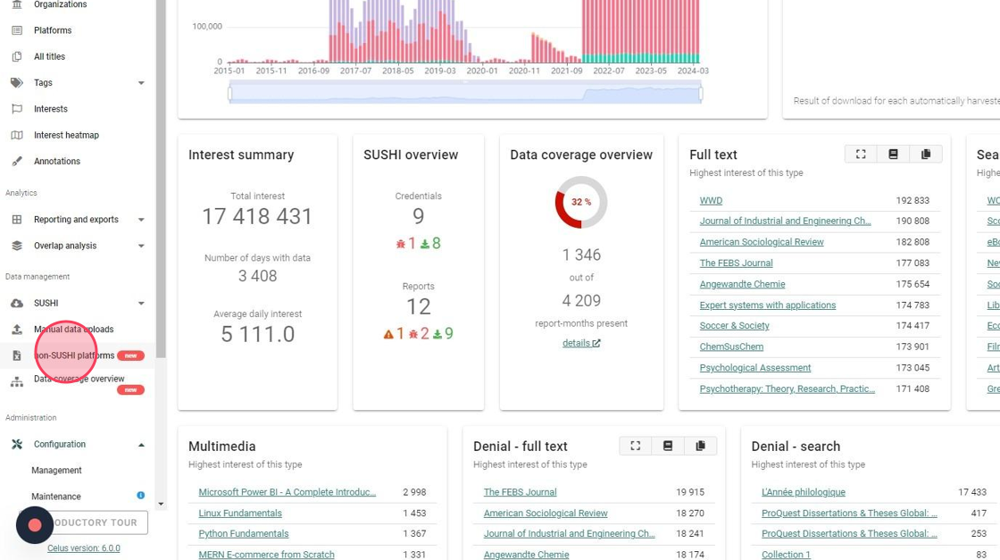 Biblioteca ENI has a working SUSHI interface, but they only provide subview reports (TR_B1, TR_B2, PR_P1, and IR_M1). CELUS cannot harvest these reports via SUSHI because they are not master reports, which could lead to discrepancies in your data.