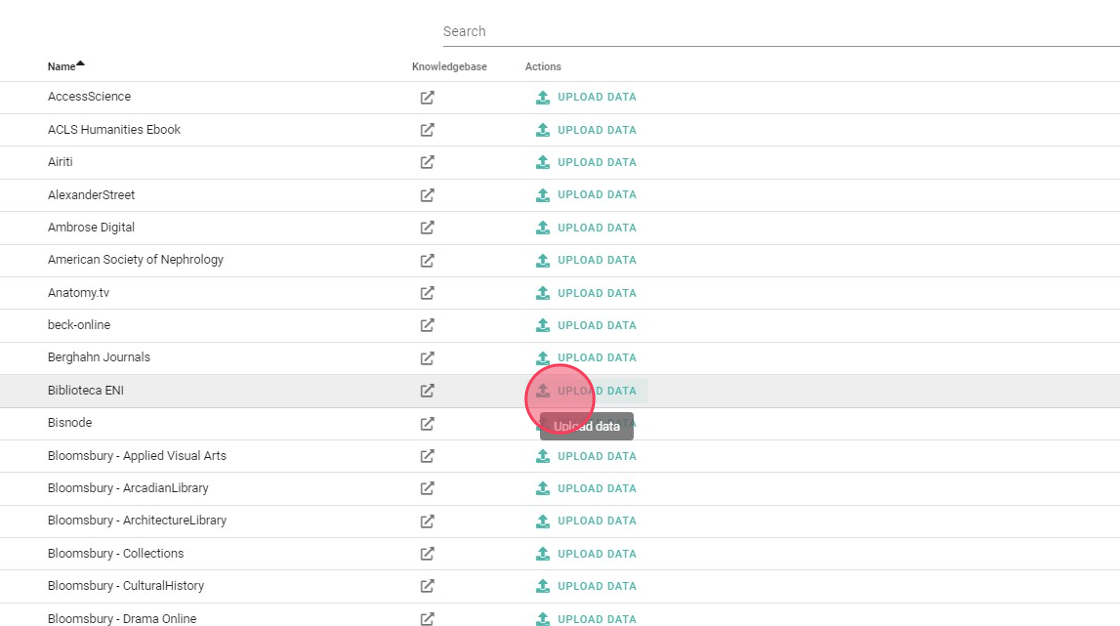2. Find "Biblioteca ENI" in the list and Click "UPLOAD DATA"